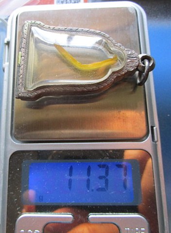 ตลับบเงิน ใส่เหรียญระฆัง หรือเซ็งลี้ฮ้อ ของหลวงพ่อเกษม น้ำหนักรวมชั่งทั้งกรอบมีฟองน้ำในนิดด้วย 11.7 กรัม ตามรูปชั่ง