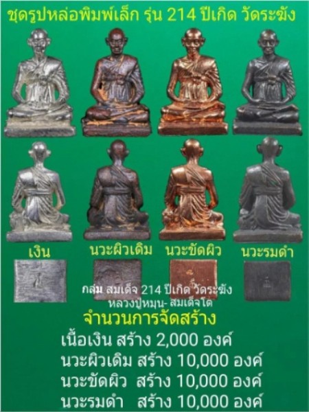 พระเครื่องรูปหล่อวัดระฆัง จำนวน 3 องค์ พระสมเด็จโต วัดระฆัง รุ่น 214 ปี ชาตกาล เนื้อนวะโลหะรมดำ, เนื้อนวะโลหะผิวเดิม, เนื้อนวะโลหะชัดผิว พิธีใหญ่พระเกจิร่วมปลุกเสกหลายท่าน พระสวยสมบูรณ์ทุกองค์ พร้อมกล่อง