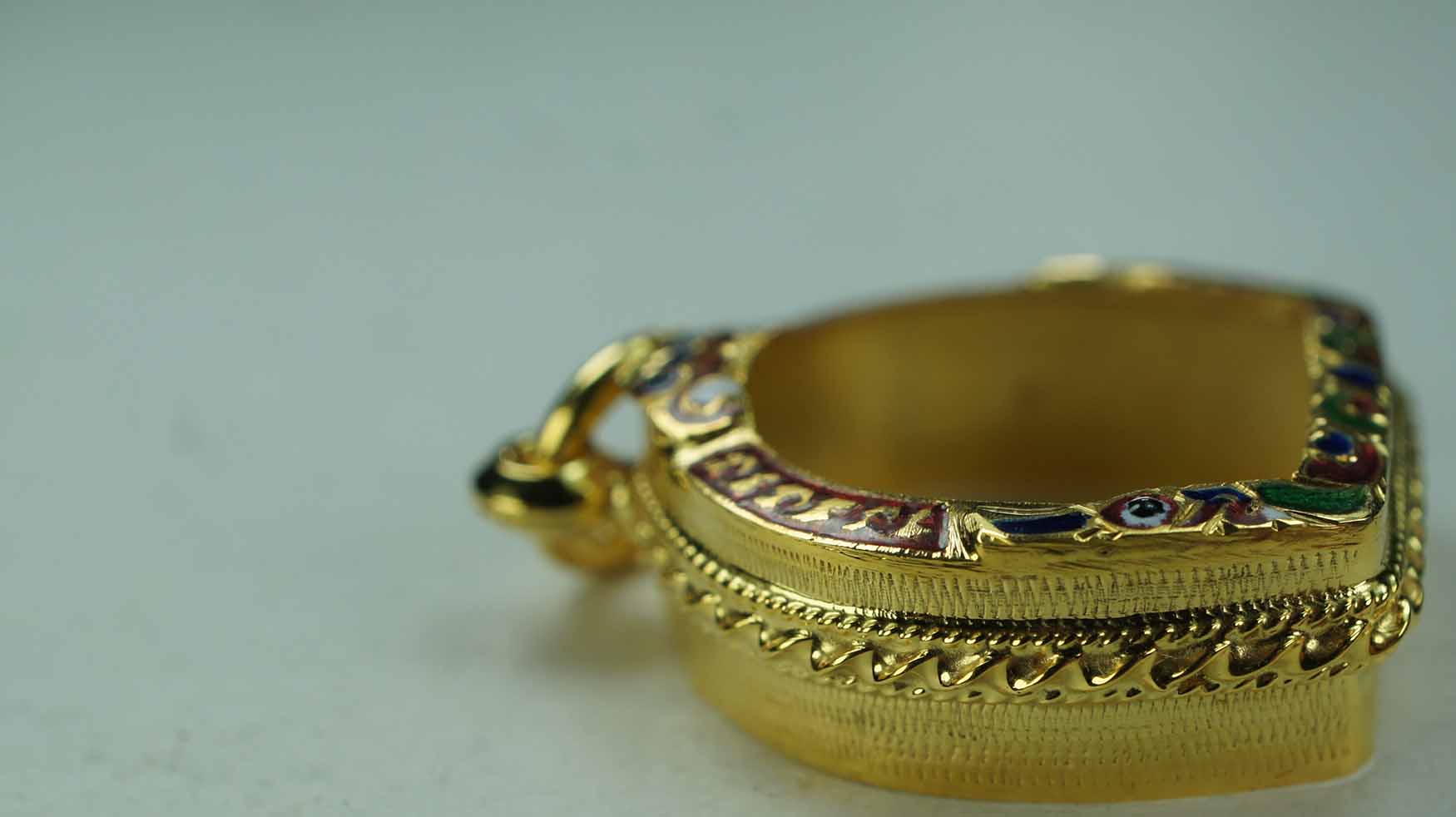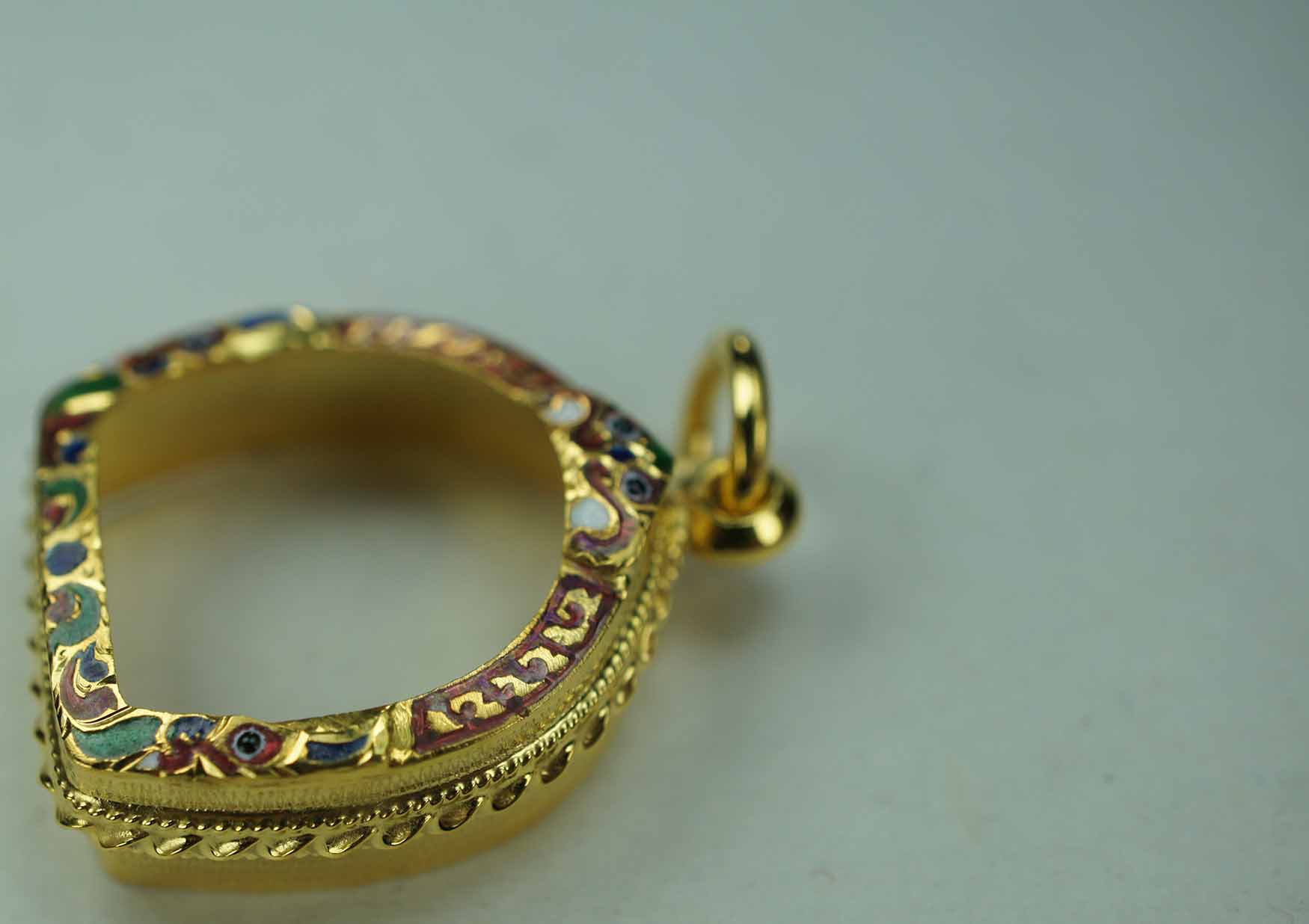 กรอบทอง ลงยาล้อม ยกซุ้ม หัวสิงห์ ข้างเกลียวโปเต้ 3 เส้น แกะลายทั้งใบ ใส่พระปิดตาปุ้มปุ้ย *** หลวงปู่ทิม วัดละหารไร่ ***หรือขนาดไกล้เคียง ขนาดกว้างจากขอบใน *** สูง 1.4 กว้างจากฐาน 1 ซม. *** งานขึ้นมือ