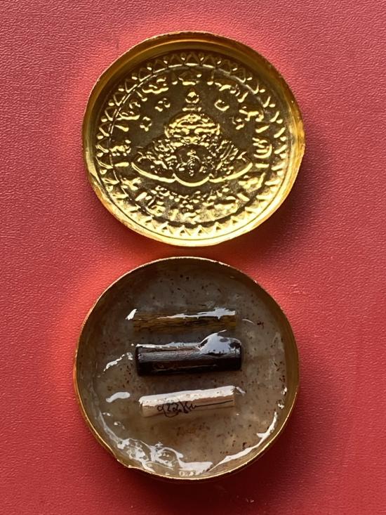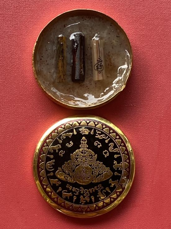 เคาะเดียวแดง สีผึ้งพระราหู รุ่น มงคลจักรวาล เนื้อ โลหะชุบทองลงยาสีดำขอบสีแดง ขนาด5ซม |