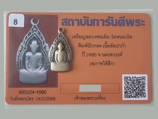 เหรียญหลวงพ่อเดิม วัดหนองโพ พิมพ์ปักกรด เนื้ออัลปาก้า ปี 2485 สวยๆ หลายหมื่น องค์นี้สภาพใช้ เคาะเดียวแดง 5,500 บาท (ตัวจริงหายากครับ มาพร้อมบัตรรับรองจีพระ)