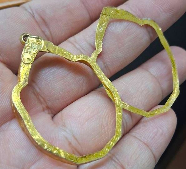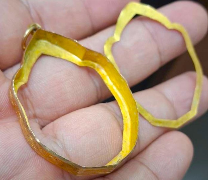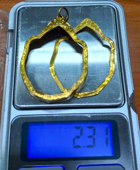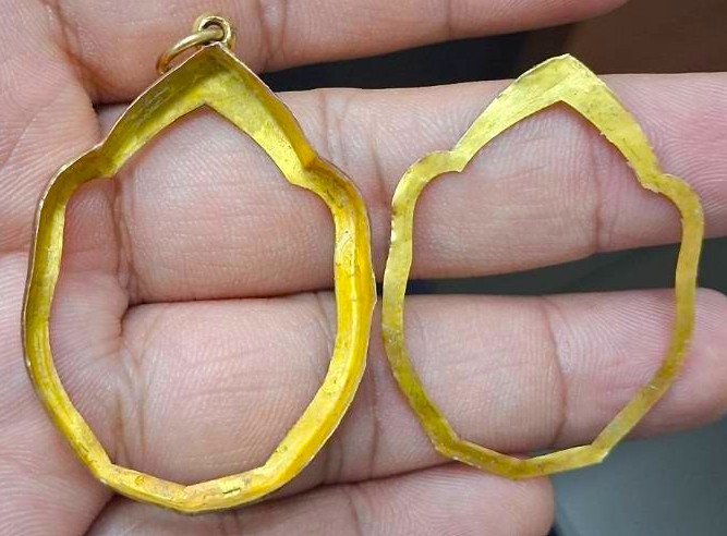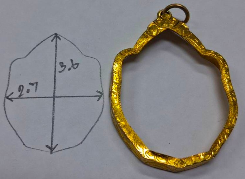กรอบทองมือสอง ใส่เหรียญมังกรหลวงปู่หมุน หลวงพ่อเอีย หรืออื่นๆที่ไกล้เคียง หน้าจอกว้าง 2.70 ซม., สูง 3.60 ซม. น้ำหนัก 2.31 กรัม เคาะเดียว