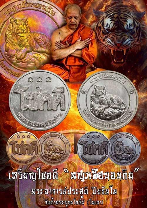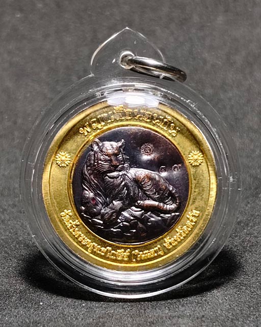 เหรียญโชคดี พญาเสือนอนกิน รุ่นแรก พระอาจารย์ประสูติ วัดในเตา จ.ตรัง เนื้อทองทิพย์ลงยาแดง หน้ากากเสือโลหะอาถรรพ์ เลข 19