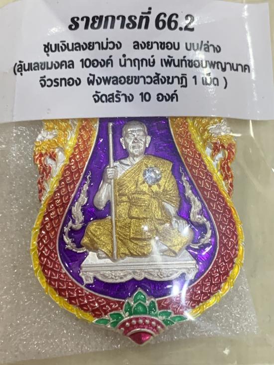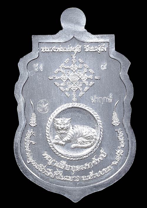 1 ใน 10 เหรียญเสมาพญาเสืออุดมทรัพย์ พระอาจารย์ประสูติ (หลวงพ่อประสูติ) วัดในเตา จ.ตรัง เนื้อชุบเงินลงยาม่วงลงยาขอบบน-ล่าง นำฤกษ์ เพ้นท์ขอบพญานาคจีวรทองฝังพลอย เลขสวยNO.9(ที่สุดของเลขมงคล) |