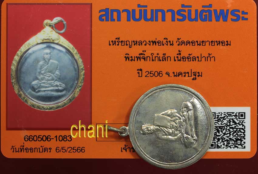 เหรียญ หลวงพ่อเงิน วัดดอนยายหอม พิมพ์จิ๊กโก๋เล็ก อาสนะลอย นิยม เนื้ออัลปาก้า ปี2506 จ.นครปฐม สภาพสวยๆไม่ผ่านการใช้ พร้อมบัตรรับรองพระแท้จากจีพระ อุ่นใจได้ค่ะ