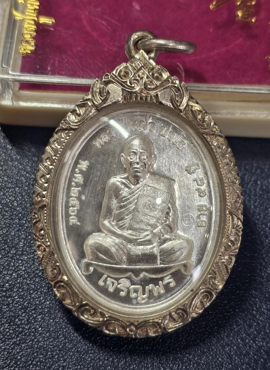 เหรียญเจริญพรล่าง หลวงปู่แผ้ว วัดรางหมัน เนื้อเงิน no.4739 เลี่ยมกรอบเงินแท้สวยๆ พร้อมกล่อง