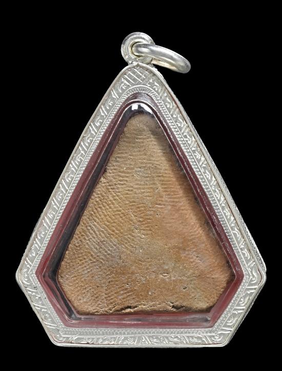 พระโพธิจักร หลวงพ่อลี วัดอโศการาม พิมพ์ห้าเหลี่ยม เนื้อดินเผา ปี 2500 เลี่ยมเงิน |