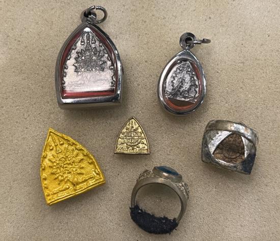 ไม่ทราบรายละเอียด ติดเหมาบ้านมาครับ มีเป็นแหวน2วง มีเป็นเหรียญหล่อผ่านไถ4อัน(ใหญ่2เล็ก2) แต่ได้จากเจ้าของที่เป็นคนนครศรีฯ