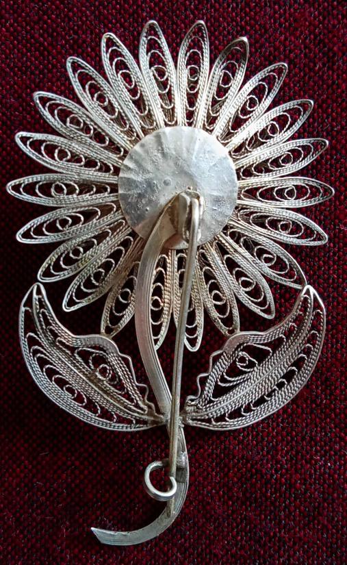 เข็มกลัดติดเสื้อ เงินแท้ ทรงดอกรักเร่ ขนาดประมาณ 2 นิ้ว 2 หุน X 1 นิ้ว 3 หุน หนักประมาณ 6 กรัม งานฝีมือถักขดเส้นเงินสุดประณีต งดงาม สภาพสวยตามรูป ส่งฟรีทั่วไทย รับประกันตามกฎครับ