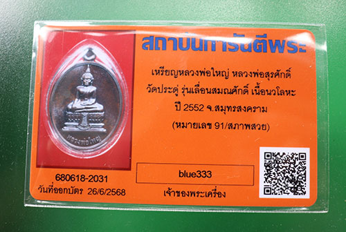 "เคาะเดียวบัตรสภาพสวย" เหรียญหลวงพ่อใหญ่ เลื่อนสมณศักดิ์ หลวงพ่อพระมหาสุรศักดิ์ วัดประดู่ เนื้อนวโลหะ หมายเลข 91(2หลักสวย) จมูกโด่ง ผิวสวยๆ กล่องเดิมและ(บัตรG-praสภาพสวย)