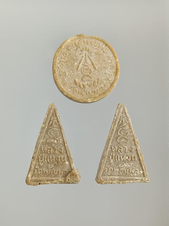 พระผงจันทร์ลอยและพระผงนางพญา หลวงปู่แหวน สุจิณฺโณ วัดดอยแม่ปั๋ง จังหวัดเชียงใหม่ ออกวัดพลับพลา จังหวัดนนทบุรี ปี 2519 รวม 3 องค์