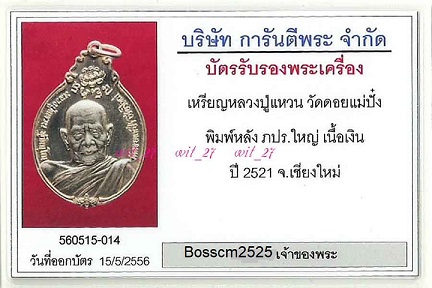 เหรียญหลวงปู่แหาน สุจิณโณ รุ่นศร้างตึกพยาบาล เนื้อเงิน พิมพ์หลัง ภปร.ใหญ่ ปี 2521 วัดดอยแม่ปั๋ง เชียงใหม่..พร้อมบัตรรับรอง G-Pra..