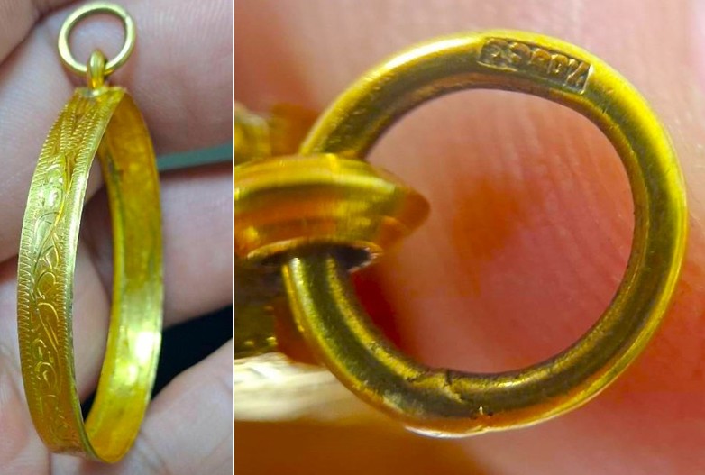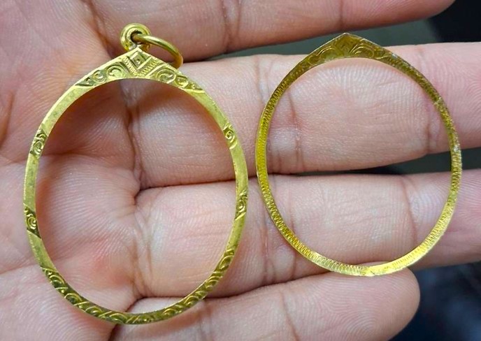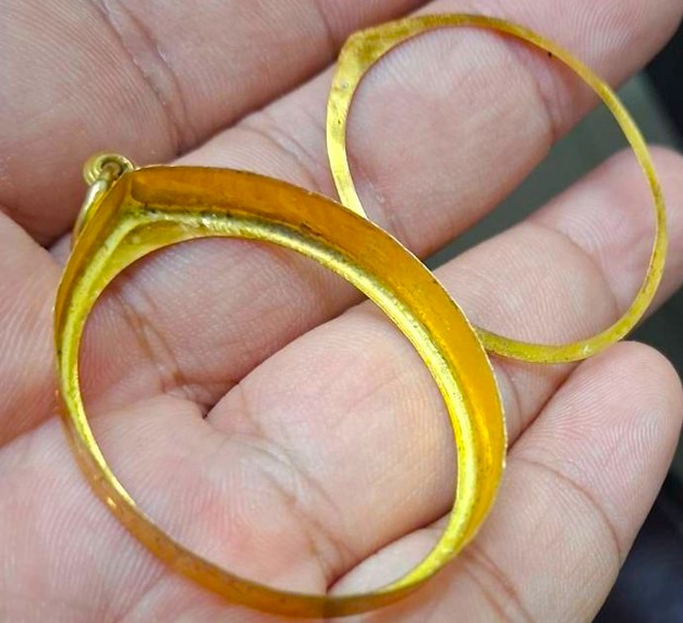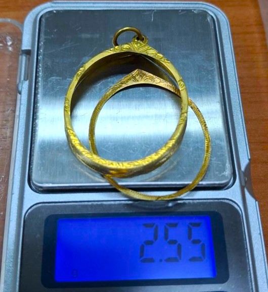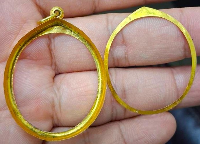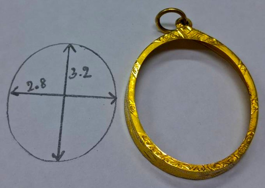 กรอบทองมือสอง ใส่เหรียญอาจาร์ฝั้น รุ่น9 หรือรูปไข่ยอดนิยมทั่วไปที่ไกล้เคียง หน้าจอกว้าง 2.80 ซม., สูง 3.20 ซม. น้ำหนัก 2.55 กรัม เคาะเดียว