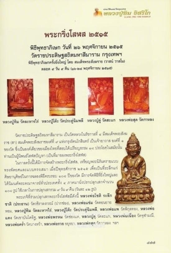 พระกริ่งโสฬส มปร. ปี 2515 วัดราชประดิษฐ์ หลวงปู่ทิม วัดะหารไร่ จ.ระยอง ปลุกเสก หายากมาก ๆ เนื้อทองเหลือง เดิมๆ นิยม เนื้อทองเหลือง สร้าง 3000องค์ พระกริ่ง มปร วัดราชประดิษฐ์สถิตมหาสีมารามราชวรวิหารปี 2515 ชื่อเดิมคือ วัดราชประดิษฐ์สถิตธรรมยุติการาม เรียกสั้นๆว่าวัดราชประดิษฐ์ฯ เป็นวัดประจำรัชกาลที่ 4 และเป็นพระอารามแห่งแรกของคณะสงฆ์ฝ่ายธรรมยุติ ซึ่งรัชกาลที่4 ทรงพระกรุณาโปรดเกล้าฯ ให้สร้างขึ้น ภายในวัดมีศิลปะในยุครัตนโกสินทร์งดงามตระการตาให้ชมมากมาย มีจิตรกรรมฝาผนังภาพการชมสุริยุปราคาในสมัยรัชกาลที่4 และเป็นที่ประดิษฐานของพระพุทธสิหิงค์ด้วยเมื่อสร้างวัดราชประดิษฐ์ ฯ เสร็จเมื่อปี พ.ศ.2408 พระบาทสมเด็จพระจอมเกล้าฯ ได้โปรดเกล้าฯ ให้อาราธนาพระสาสนโสภณ จากวัดบวรนิเวศฯ มาครองวัดราชประดิษฐ์ฯ เป็นเจ้าอาวาสองค์แรก ซึ่งต่อมาภายหลังในรัชสมัยพระบาทสมเด็จพระจุลจอมเกล้าฯ ได้ทรงดำรงตำแหน่งเป็นสมเด็จพระสังฆราชพระองค์ที่ 9 แห่งกรุงรัตนโกสินทร์ สถิต ณ วัดราชประดิษฐ์สถิตมหาสีมาราม เมื่อปีพ.ศ.2436 ถึงปีพ.ศ.2442 รวม 6 พรรษา ประวัติของสมเด็จพระสังฆราช(สา ปุสฺสเทโว) เมื่อย้อนไปเมื่อพระชนมายุได้ 18 ปี ทรงแปลพระปริยัติธรรม 9 ประโยค ได้เป็นเปรียญเอกตั้งแต่ยังทรงเป็นสามเณร นับเป็นสามเณรองค์แรกที่ได้เป็นเปรียญ 9 ประโยคในสมัยกรุงรัตนโกสินทร์ ต่อมาได้ลาสิกขาไปเป็นฆราวาสอยู่พักหนึ่ง และเมื่อพระชนมายุได้ 38 ปี ได้กลับมาอุปสมบทใหม่ ว่ากันว่า ได้ทรงเข้าแปลพระปริยัติธรรมอีกครั้งหนึ่ง และทรงแปลได้หมดทั้ง 9 ประโยค จึงมีผู้กล่าวถึงพระองค์ด้วยสมญานามว่า "สังฆราช 18 ประโยค"(โสฬส) ในปีพ.ศ.2515 เพื่อเป็นที่ระลึกแก่ศิษย์ยานุศิษย์ในการฉลองวัดครบรอบ 108 ปี ทางวัดได้จัดสร้างวัตถุมงคล พระกริ่งโสฬส, เหรียญพระนิรันตรายแบบพัดยศและแบบเสมา ได้มีการจัดพุทธาภิเษก ในพระอุโบสถวัดราชประดิษฐ์สถิตมหาสีมารามเป็นเวลา 9 วัน 9 คืน พระกริ่งโสฬสเป็นพระกริ่งที่ฉีดชักกริ่งในตัว ชนวนที่นำมาหลอมฉีดพระกริ่ง และเหรียญ ได้นำมาจาก คณาจารย์ ชื่อดังทั่วทั้ง ๔ ภาคของประเทศไทย ในการหลอมยันต์ในครั้งนี้ใช้เวลาในการหลอมเป็นเวลานานมาก เพราะยันต์ของคณาจารย์บางท่านกว่าจะหลอมละลายได้ ต้องใช้เวลานานพอสมควร ตามธรรมดาแล้ว แผ่นทองเหลือง, แผ่นทองแดง เมื่อใส่ลงในเบ้าหลอมแล้วก็จะละลายโดยง่ายดาย แต่ยันต์ที่นำมาหลอมทำพระกริ่ง และเหรียญพระนิรันตรายนั้นหลอมละลายได้ยากมาก รูปแบบของพระกริ่งโสฬส เป็นพระกริ่งฉีดวรรณะ เนื้อทองเหลืองรมดำ ถอดแบบมาจากพระกริ่งสายวัดสุทัศน์ ด้านหลังมีพ