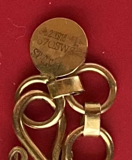 เคาะเดียวปิดขั้นต่ำ สำหรับ สร้อยข้อเท้าเด็กเล็ก(รับขวัญแรกเกิด) ทองคำแท้ 91.5% รหัส (916) แผ่นป้ายวงกลมทองมีความหนาในตัว ระบุ 916 และ TT78 ส่วนอีกด้านมีโลโก้ 2 ตัว และตัวหนังสือ 22K916 และ 57QSW3 และ ST-0.810