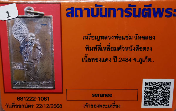 เหรียญหลวงพ่อแช่ม วัดฉลอง พิมพ์สี่เหลี่ยมตัวหนังสือตรง เนื้อทองแดง ห่วงเดิม ปี2484 จ.ภูเก็ต + บัตรG-pra สภาพสวยเดิมค่ะ |