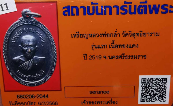เหรียญหลวงพ่อกล่ำ วัดวิสุทธิยาราม(ศาลาบางปู) รุ่นแรก เนื้อทองแดง ห่วงเดิม ปี2519 จ.นครศรีธรรมราช + บัตรG-pra สภาพสวยเดิมค่ะ