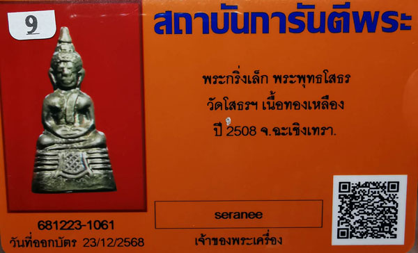 พระกริ่งเล็กพระพุทธโสธร วัดโสธรฯ เนื้อทองเหลือง กริ่งดัง ก้นกลึง ปี2508 จ.ฉะเชิงเทรา + บัตรG-pra สภาพเดิมค่ะ