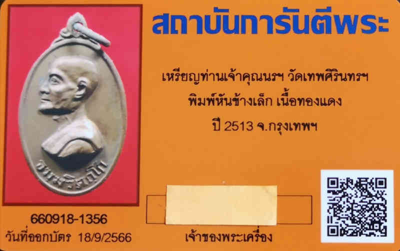 เหรียญท่านเจ้าคุณนรฯ วัดเทพศิรินทร์ พิมพ์หันข้างเล็ก เนื้อทองแดง ปี2513 พร้อมบัตรรับรอง