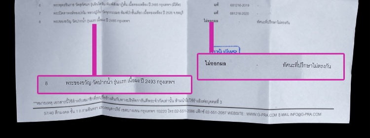 ในเบื้องต้น มีใบตรวจสอบพระเป็นข้อมูลในการประกอบการพิจารณา แต่ไม่สามารถอ้างอิงกับบุคคลที่สามได้ (ไม่อยากแกะจากเลี่ยมเดิม เนื่องจากพระเป็นพระผงเก่า เกรงว่าจะชำรุด) ดังนั้น ท่านที่ชอบค่อบพิจารณาให้ชอบก่อนเคาะค่ะ จะได้ไม่เสียเวลาทั้งสองฝ่าย ขอบคุณมากค่ะ