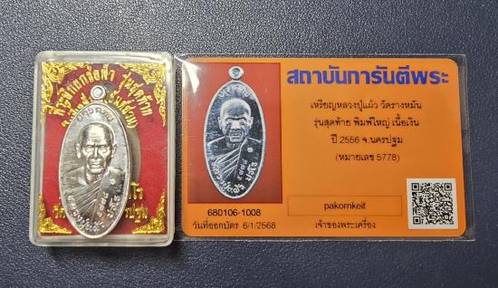 เหรียญใบขี้เหล็ก หลวงปู่แผ้ว วัดรางหมัน รุ่นสุดท้าย พิมพ์ใหญ่ เนื้อเงิน ปี 2556 สภาพสวย พร้อมบัตรรับรอง