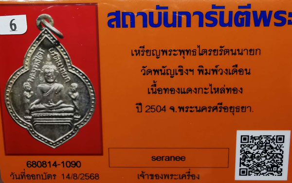 เหรียญพระพุทธไตรยรัตนนายก วัดพนัญเชิงฯ พิมพ์หลังวงเดือน เนื้อทองแดงกะไหล่ทอง ห่วงเดิม ปี2504 จ.พระนครศรีอยุธยา + บัตรG-pra สภาพสวยเดิมค่ะ สภาพตามรูปทุกประการค่ะ