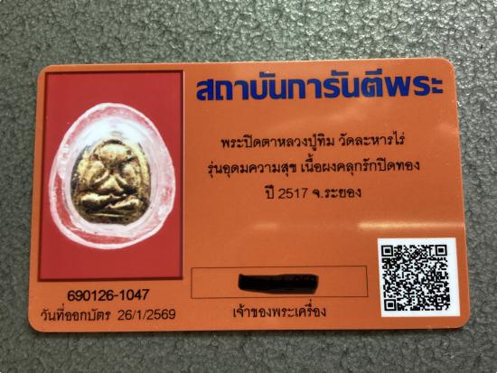 พระปิดตาหลวงปู่ทิม วัดละหารไร่ รุ่นอุดมความสุข เนื้อผงคลุกรักปิดทอง ปี 2517 มาพร้อมบัตร Gpra