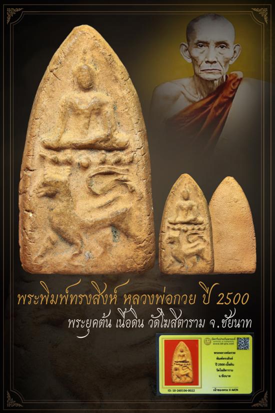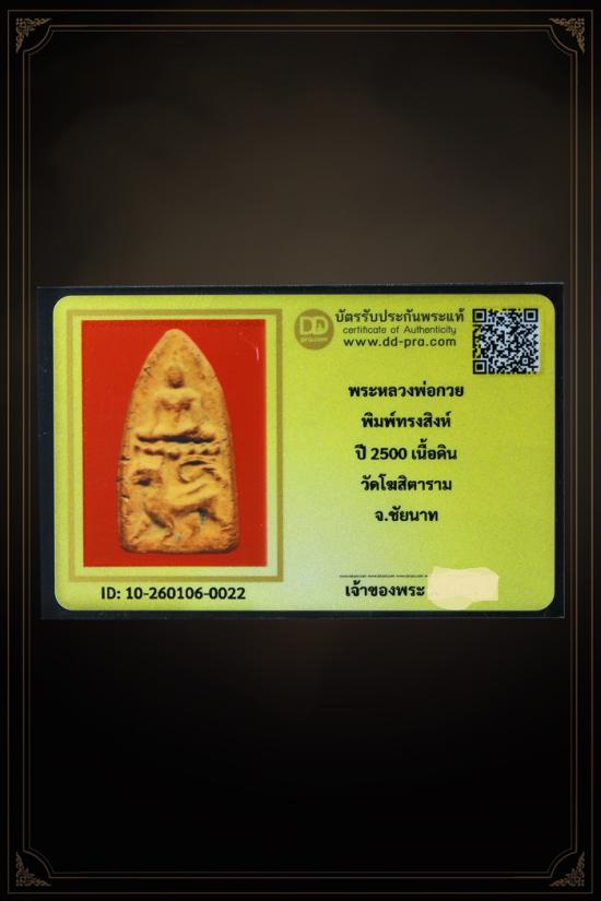 พระหลวงพ่อกวย พิมพ์ทรงสิงห์ ปี 2500 เนื้อดิน ยุคต้น วัดโฆสิตาราม จ.ชัยนาท +++ หายากมาก ครับ ข้อมูลตามบัตรรับประกันครั