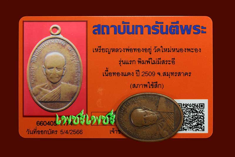 เหรียญ หลวงพ่อทองอยู่ วัดใหม่หนองพะองค์ รุ่นแรก พิมพ์ไม่มีสระอี นิยม เนื้อทองแดง ปี2509 จ.สมุทรสาคร สภาพพอสวย พร้อมบัตรรับรองพระแท้จากการันตีพระสบายใจได้พระแท้แน่นอน ค่ะ