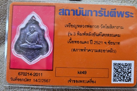 เหรียญหลวงพ่อกวย หลังยันต์ 2521 พร้อมทองพร้อมบัตรครับ