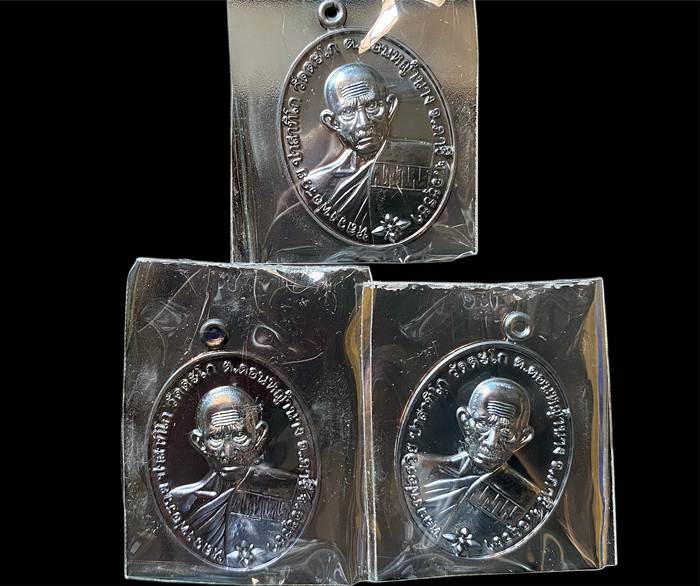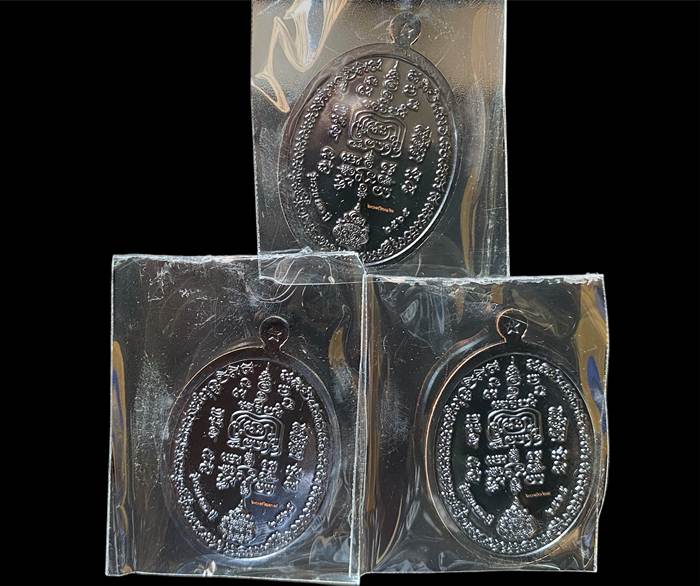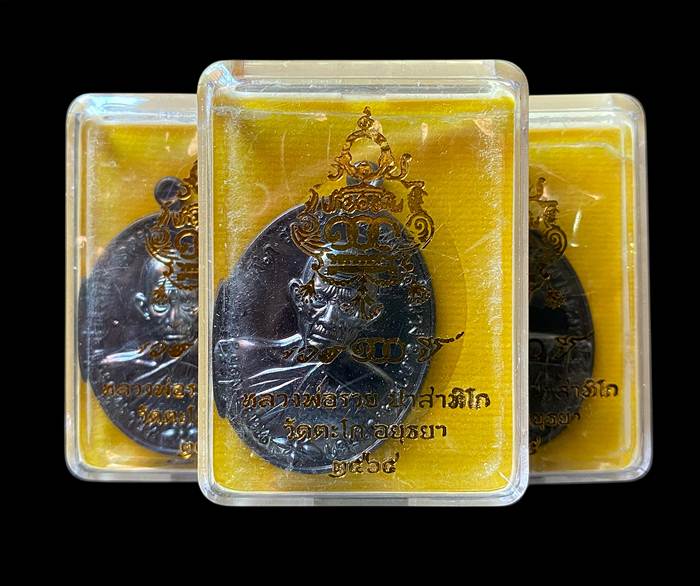 เหรียญไข่แจกทาน รุ่น "รวย 100 ปี" หลวงพ่อรวย วัดตะโก อยุธยา ปี 2565 เนื้อทองแดงรมดำ 3 เหรียญ ตอกโค๊ต/หมายเลข กล่องเดิมครับ