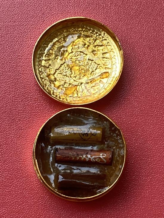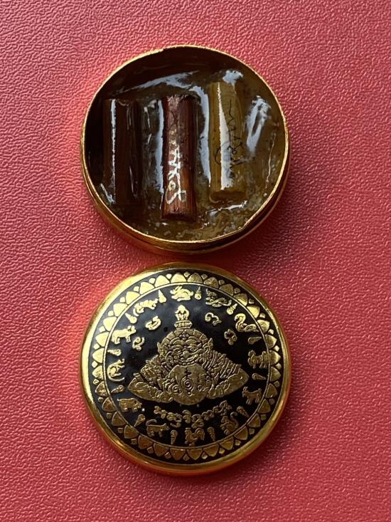 เคาะเดียวแดง สีผึ้งพระราหู รุ่น มงคลจักรวาล เนื้อ โลหะชุบทองลงยาสีดำขอบสีดำ ขนาด 3.2ซม |