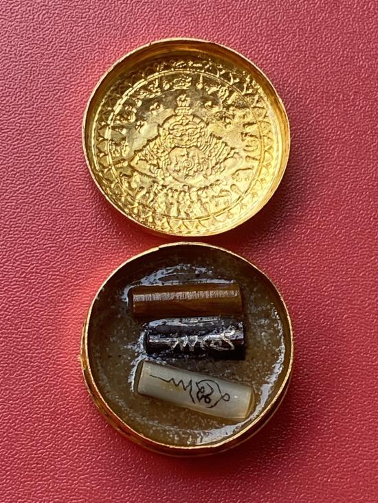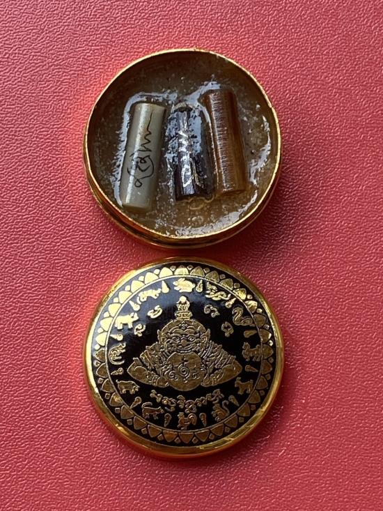 เคาะเดียวแดง สีผึ้งพระราหู รุ่น มงคลจักรวาล เนื้อ โลหะชุบทองลงยาสีดำขอบสีดำ ขนาด 3.2ซม |