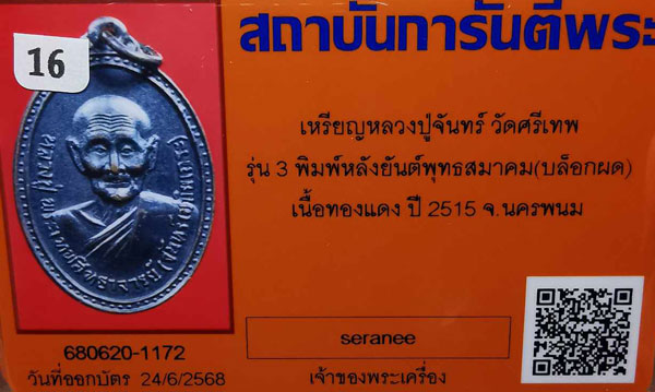 เหรียญหลวงปู่จันทร์ วัดศรีเทพ รุ่น3 พิมพ์หลังยันต์พุทธสมาคม(บล๊อคผด) เนื้อทองแดง (ตอกโค้ต) ห่วงเดิม ปี2515 จ.นครพนม + บัตรG-pra สภาพเดิมค่ะ สภาพตามรูปทุกประการค่ะ