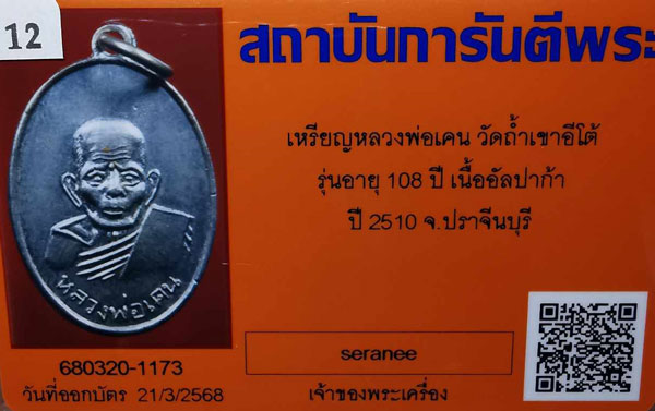 เหรียญหลวงพ่อเคน วัดถ้ำเขาอีโต้ รุ่นอายุ108ปี เนื้ออัลปาก้า ห่วงเดิม ปี2510 จ.ปราจีนบุรี + บัตรG-pra สภาพสวยเดิมค่ะ