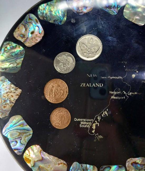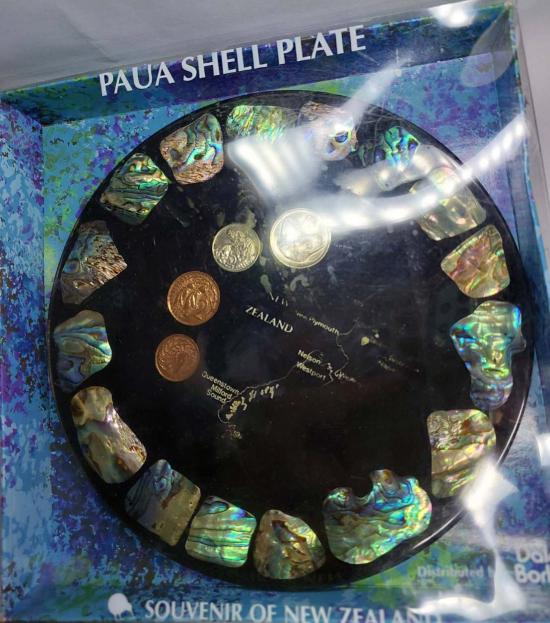 ***วัดใจ***จานเปลือกหอยเป๋าฮื้อ (Paua Abalone Shell Plate) ฝังเหรียญกษาปณ์ของที่ระลึกจากนิวซีแลนด์