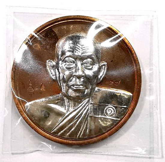 เหรียญทำน้ำมนต์ รุ่นแรก เนื้อทองแดง หน้ากากเงิน หลวงพ่อทองหยิบ วัดบ้านกลาง จ.อ่างทอง ปี 2553 ตอกโค๊ด และหมายเลขทุกองค์ ขนาดเหรียญกลม 35 มม.(3.5ซ.ม.) เนื้อทองแดง หน้ากากเงินนี้สร้างเพียง 220 เหรียญเท่า