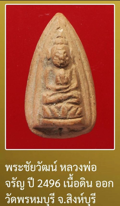 พระชัยวัฒน์ หลวงพ่อจรัญ (พระธรรมสิงหบุราจารย์) วัดพรหมบุรี จ.สิงห์บุรี ปี 2496 เนื้อดิน ถือเป็นหนึ่งในพระเครื่องชุด "รุ่นแรก" ที่ทรงคุณค่าที่สุดของท่านครับ พระชุดนี้โดดเด่นทั้งมวลสารและพิธีปลุกเสกที่ "ดีนอก-ดีใน" อย่างสมบูรณ์แบบ
