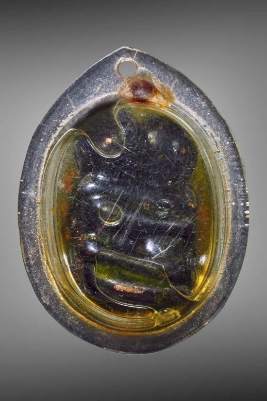 //เคาะแดง//เครื่องรางมหาเสน่ห์ อิ้นคู่ เนื้อโลหะหลังยันต์ เลี่ยมเดิมน้ำมันจันทร์ ไม่ทราบที่ครับ |
