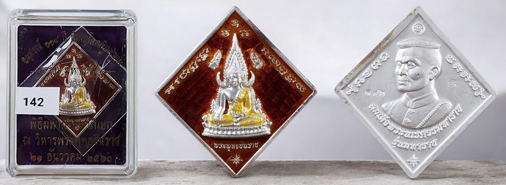 (เนื้อเงินลงยาสีแดง) เหรียญสี่เหลี่ยมข้าวหลามตัด พระพุทธชินราชหลังพระนเรศวร รุ่นมหาราช 118 ปีเนื้อเงินลงยา(สีน้ำแดง) หมายเลข 142 สภาพสวยมากๆ พร้อมกล่องครับ |