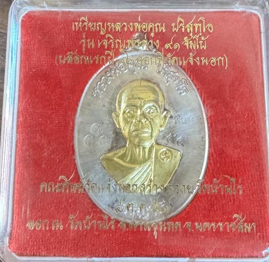 เหรียญจัมโบ้ หลวงพ่อคูณ ปริสุทฺโธ รุ่นเจริญพรล่าง91 เนื้อเงินหน้าทองคำ หมายเลข55 (เหรียญเงินหน้าทองคำหนัก37.7กรัม มีกลองครับ