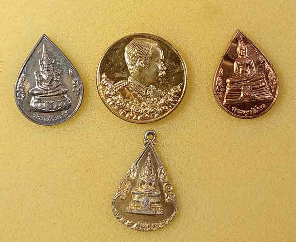 ชุดเหรียญ ณ พระอุโบสถ วัดพระแก้ว พิธีมหาพุทธาภิเษก ฉลองในหลวงรัชกาลที่ 9ครองราชครบ 50 ปี กาญจนาภิเษก รุ่นนี้ช ื่อ ร่ำรวย มั่งมี ศรีสุข. กล่องเดิม