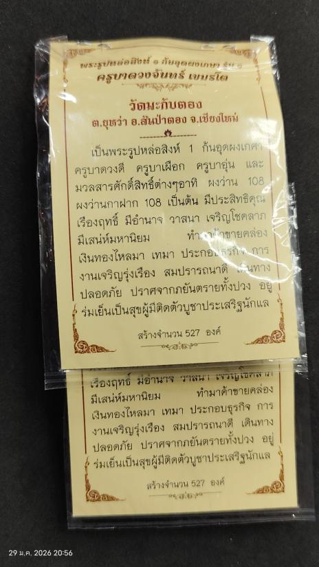 **100.**(2องค์) พระรูปหล่อ พระสิงห์ 1 อุดผงเกษารุ่น 1 ครูบาดวงจันทร์ เนื้อทองแดงรมดำ ซองเดิมจากวัด (ยังไม่ได่แกะซอง สร้างจำนวน527องค์) |