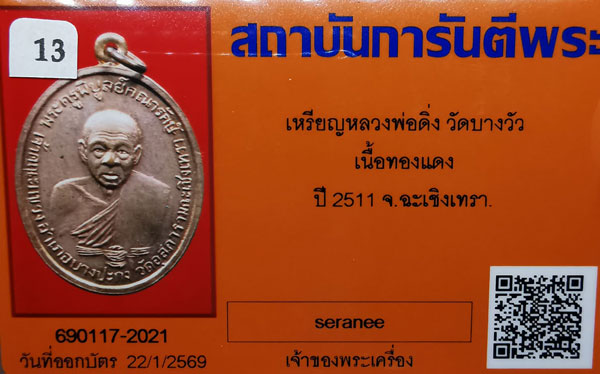 เหรียญหลวงพ่อดิ่ง วัดบางวัว เนื้อทองแดงผิวไฟ ห่วงเดิม ปี2511 จ.ฉะเชิงเทรา + บัตรG-pra สภาพเดิมค่ะ