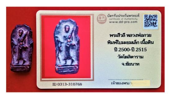พระสีวลี หลวงพ่อกวย พิมพ์ใบมะยมเล็ก เนื้อดิน ปี 2500-ปี 2515 วัดโฆสิตาราม + บัตรรับรอง