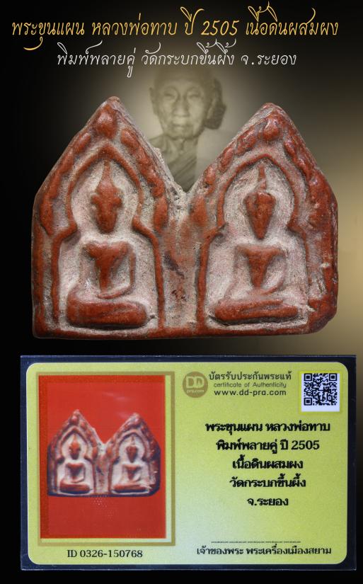 พระขุนแผน หลวงพ่อทาบ พิมพ์พลายคู่ ปี 2505 เนื้อดินผสมผง วัดกระบกขึ้นผึ้ง จ.ระยอง (หลวงปู่ทิม ปลุกเสก) + บัตรรับประกันพระแท้