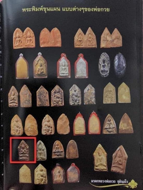พิมพ์ทรง: เป็นพระพุทธปางมารวิชัยประทับนั่งในซุ้มเรือนแก้ว โดยมีลักษณะพิเศษคือ ด้านล่างใต้ฐานจะมีรูปกุมารทองนอนอยู่ (บางคนเรียกพิมพ์ขุนแผนชมตลาด หรือขุนแผนพลายคู่กุมารทอง) ซึ่งสื่อถึงการที่หลวงพ่อกวยท่านเสกให้ขุนแผนและกุมารทองเกื้อหนุนกัน