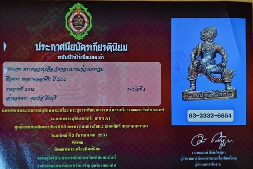 หนุมานมหาลาภ รุ่นแรก หลวงปู่เจือ วัดกลางบางแก้ว ปี 2552 เจิมแป้งในพิธี องค์แชมป์ที่1 งานศูนย์ราชการฯ พร้อมใบประกาศ |
