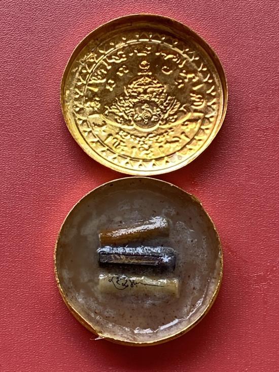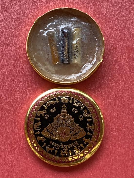 เคาะเดียวแดง สีผึ้งพระราหู รุ่น มงคลจักรวาล เนื้อ โลหะชุบทองลงยาสีดำขอบสีแดง ขนาด5ซม |