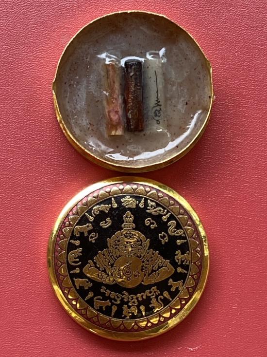 เคาะเดียวแดง สีผึ้งพระราหู รุ่น มงคลจักรวาล เนื้อ โลหะชุบทองลงยาสีดำขอบสีแดง ขนาด5ซม |